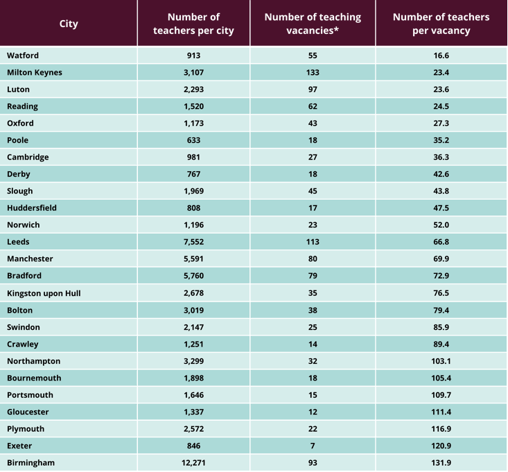 For the largest 50 towns and cities in the UK, we collated 2022 Census data on the number of teachers per city and compared this with the number of current teaching vacancies*, to find out where there were the lowest number of teachers per vacancy.