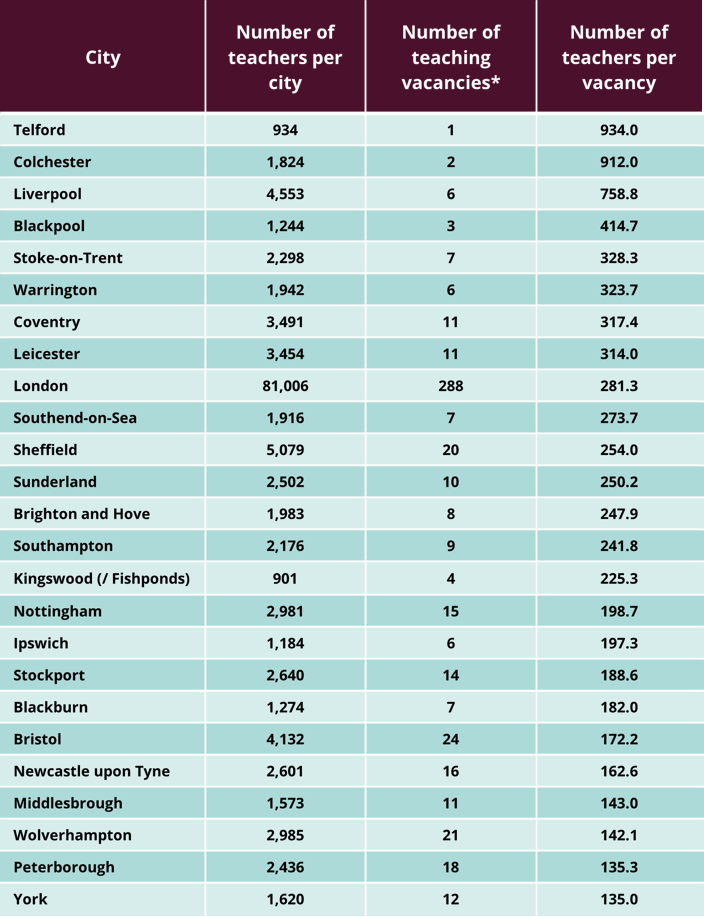 Colchester had the second-fewest teacher shortages (912 teachers per vacancy) and Liverpool the third-fewest (758.8 teachers per vacancy), with the numbers dropping for Blackpool (414.7 teachers per vacancy) in fourth place and Stoke on Trent (328.3 teachers per vacancy) in fifth place.