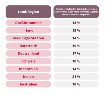 - Betriebe verlieren im Schnitt 409 Stunden pro Jahr (etwa 51 Arbeitstage) durch das Wechseln zwischen getrennten Systemen