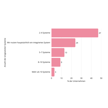 Das Ergebnis unserer Umfrage unter 150 Unternehmen und Betrieben im DACH-Raum: In Deutschland liegt die durchschnittliche Zahl der regelmäßig genutzten Systeme bei 4 bis 5, in der Schweiz steigt sie auf über 5.