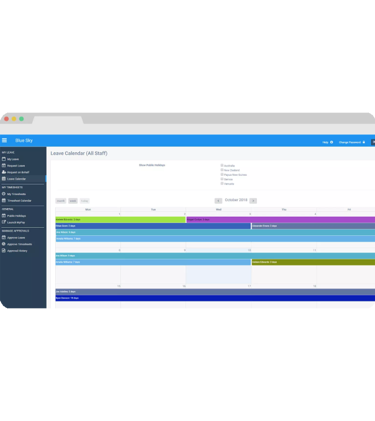 The staff calendar allows employees and managers to view the leave plans of other staff and foresee periods of over- or under-staffing. Manage staff levels by tracking all absences and record the attendance and non-availability of contractors. Identify employees with excess accumulated leave to prevent future cash flow impacts, and indicate potential leave reporting failures.