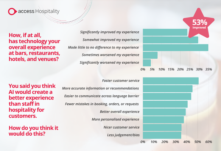 The verdict? 53% of customers say that hospitality tech has improved their overall experience at bars, restaurants, hotels and venues. On top of that, 35% think that AI would improve their experience, providing faster service (51%), fewer mistakes in bookings and orders (41%) and more accurate recommendations (45%).