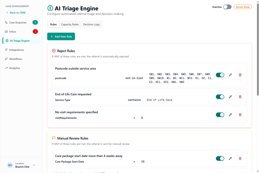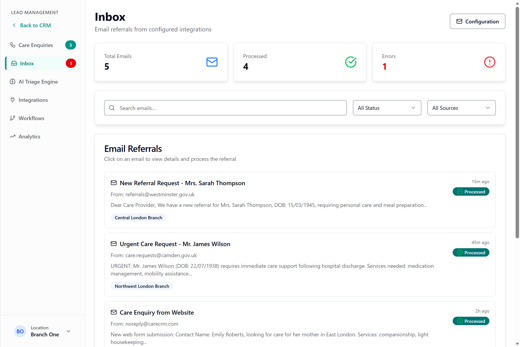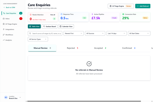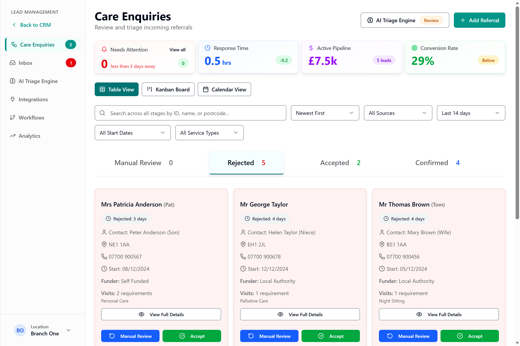 Medium-sized organisations benefit from consistent, network wide responsiveness. Care Connect gives them real-time capacity visibility across all locations, helping standardise how enquiries are handled and ensuring no opportunities are missed across the network.