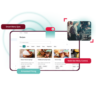 Store menus, dishes and sub‑recipes in a single, structured library across all sites.