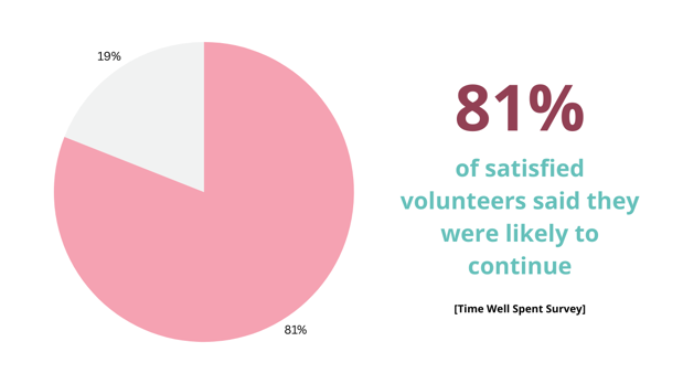 Research by NCVO shows that volunteer satisfaction is strongly linked to retention. The Time Well Spent survey found that 81% of satisfied volunteers said they were likely to continue, compared with just 26% of dissatisfied volunteers.