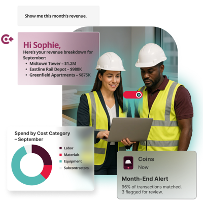 Access Coins Evo integrates construction-specific AI with your data to give finance teams live visibility, automated reporting and predictive insights. Control costs, stay compliant and make data-driven decisions.